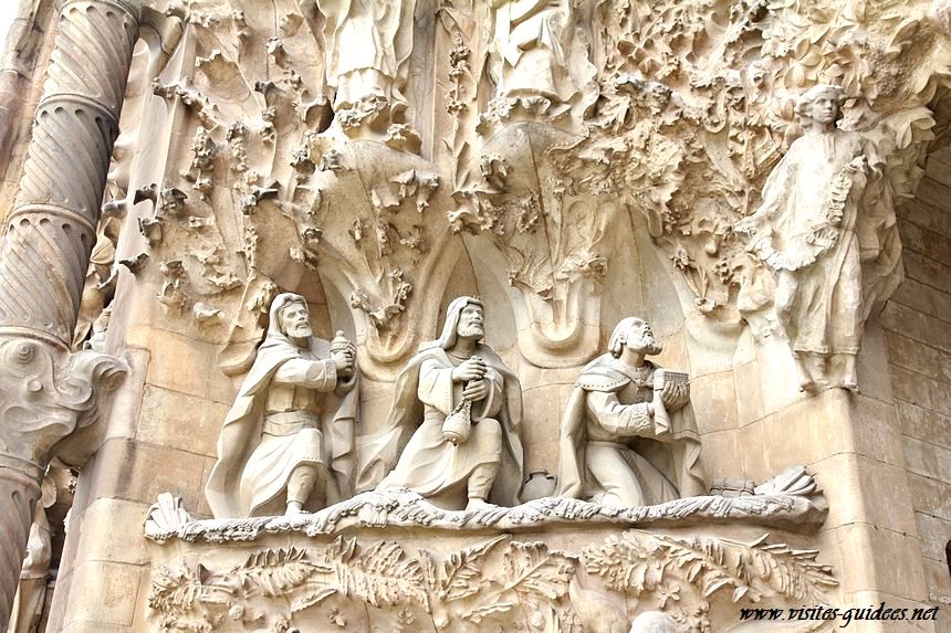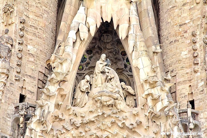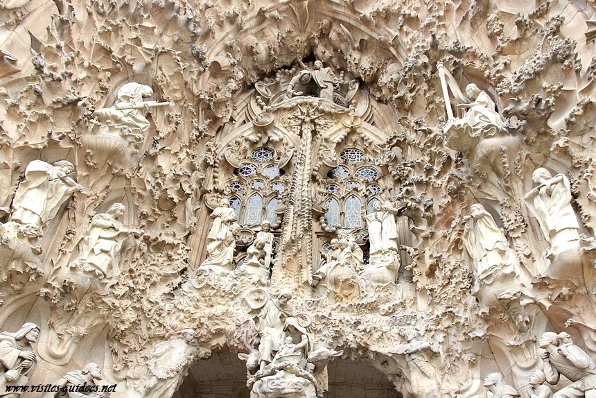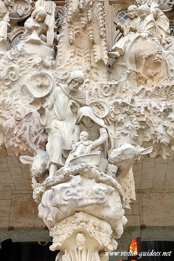 La façade de la Nativité, dite « du Levant », est la seule à avoir été construite du vivant de Gaudí. Les travaux du temple ont continué à partir de cette porte, puisque, comme Gaudí le dit : « […] si au lieu de faire cette façade décorée, ornée, ampoulée, j'avais commencé par celle de la Passion, dure, aride, comme faite d'os, les gens se seraient plaints. » Gaudí voyait dans la Nativité le symbole de la vie et de la création, inspirant du coup l'ornementation exubérante et chargée. Des animaux et des outils se mélangent aux symboles.