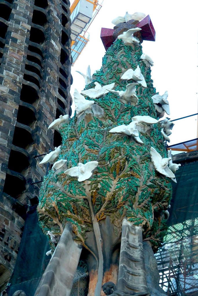 Gaudí réserva le sommet de la porte à l'arbre de vie. L'architecte fit couronner la sculpture de l'arbre (un cyprès) de 21 colombes blanche en albâtre et d'un pélican qui alimente ses petits, tout un symbole eucharistique. Au pied de cet arbre de vie se trouvent les sculptures des anges porteurs du pain et du vin. C'est l'un des rares ensembles sculpturaux élaborés par Gaudí en personne.