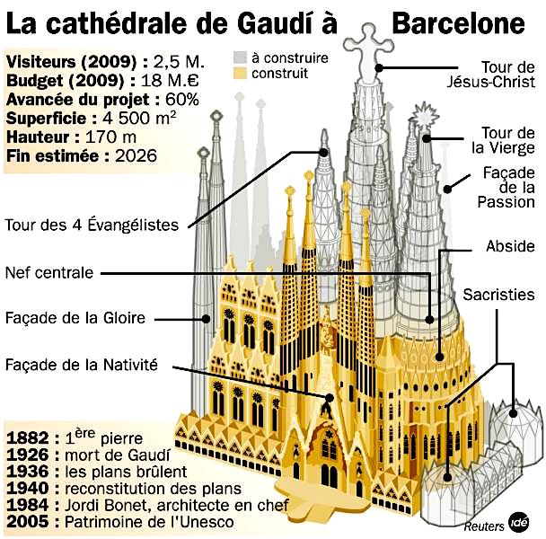Antoni Gaudi (1852-1926), surnommé "l'architecte de Dieu", voulait un temple parfait à Barcelone. Plus de 140 ans après, le prodige semble s'être accompli : la basilique inachevée de la Sagrada Família (Sainte Famille), financée uniquement par des dons et prisée par 20 millions de visiteurs, est couronnée comme "le plus beau bâtiment au monde", avec "l'intérieur le plus remarquable", et bientôt "la tour la plus haute".