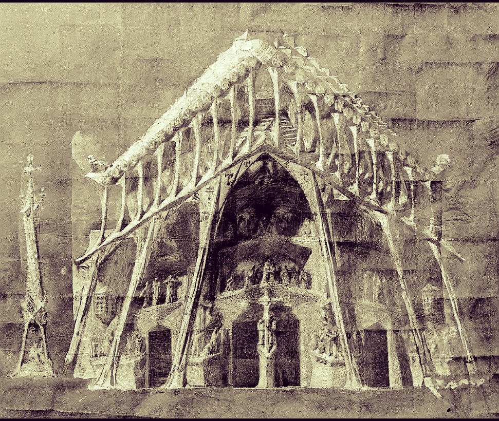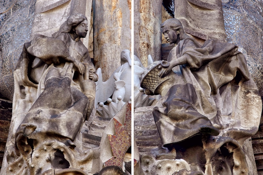 De cette étape, il laissa des ébauches qui servirent de source d'inspiration pour la reprise des travaux en 1954, mais s'en tint uniquement à la partie décorative, laissant aux générations futures l'interprétation du programme sculptural. Une fois la structure du portail et les quatre clochers achevés, c'est le sculpteur Josep Maria Subirachs qui à partir de 1954 se chargea de mettre en scène toute la souffrance et la tristesse que Gaudi avait imaginé pour cette façade orientée symboliquement vers le coucher du soleil.