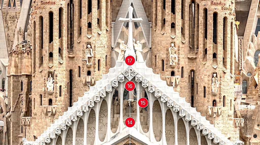 Une fois achevée, la construction de ce temple moderniste fera de lui l'église la plus haute du monde. Cela grâce à la tour dite Tour de Jésus, la plus imposante de l'ensemble, qui atteindra une hauteur de 172,5 mètres. Le projet de Gaudí dépassera ainsi de 11 mètres l'église d'ULM, en Allemagne, qui détient jusqu'à présent ce record avec 161 mètres. Les 18 tours représentent les 12 apôtres, la Mère de Dieu, les 4 évangélistes et Jésus-Christ. Ces tours sont alignées de telle sorte qu'elles sont orientées vers des points significatifs dans le ciel. Ainsi, la tour de Jésus-Christ est la plus haute de toutes, mais pensée pour être plus basse que la montagne de Montjuïc. Pourquoi? Parce que Gaudí croyait que l'œuvre de l'homme ne pouvait jamais surpasser celle de Dieu.