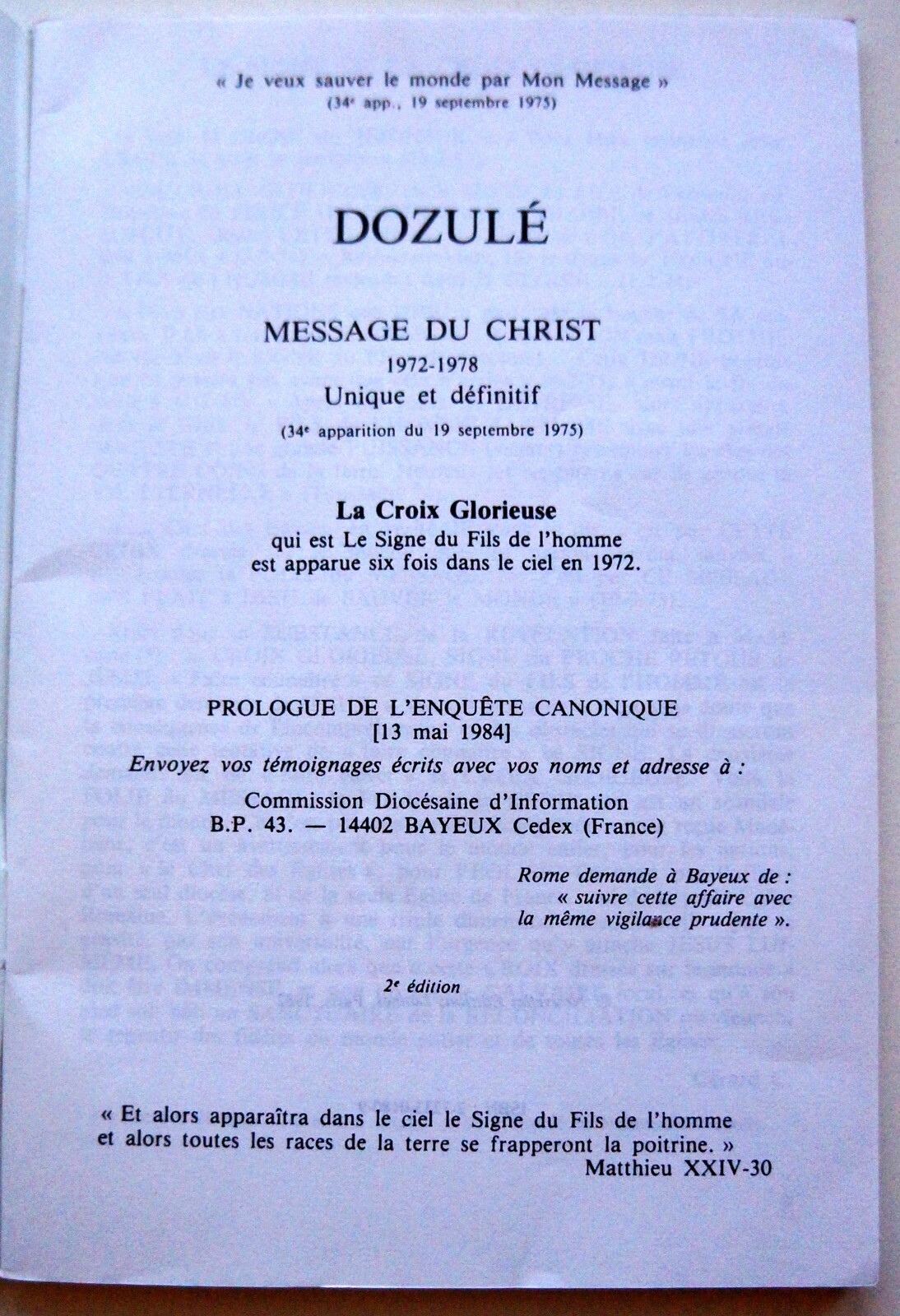 Dozulé : l'ultime message du Christ à l'humanité. Voici un document irréfutable et passionnant qui dévoile toute la vérité sur le plus important message prophétique recueilli par l'Eglise, selon la volonté d'un conseiller personnel du Pape. Ce récit marque l'aboutissement et la réalisation pour notre génération de toutes les prophéties antérieures, et restitue aux hommes ce qu'ils auraient dû connaître par la voix officielle de l'Eglise.