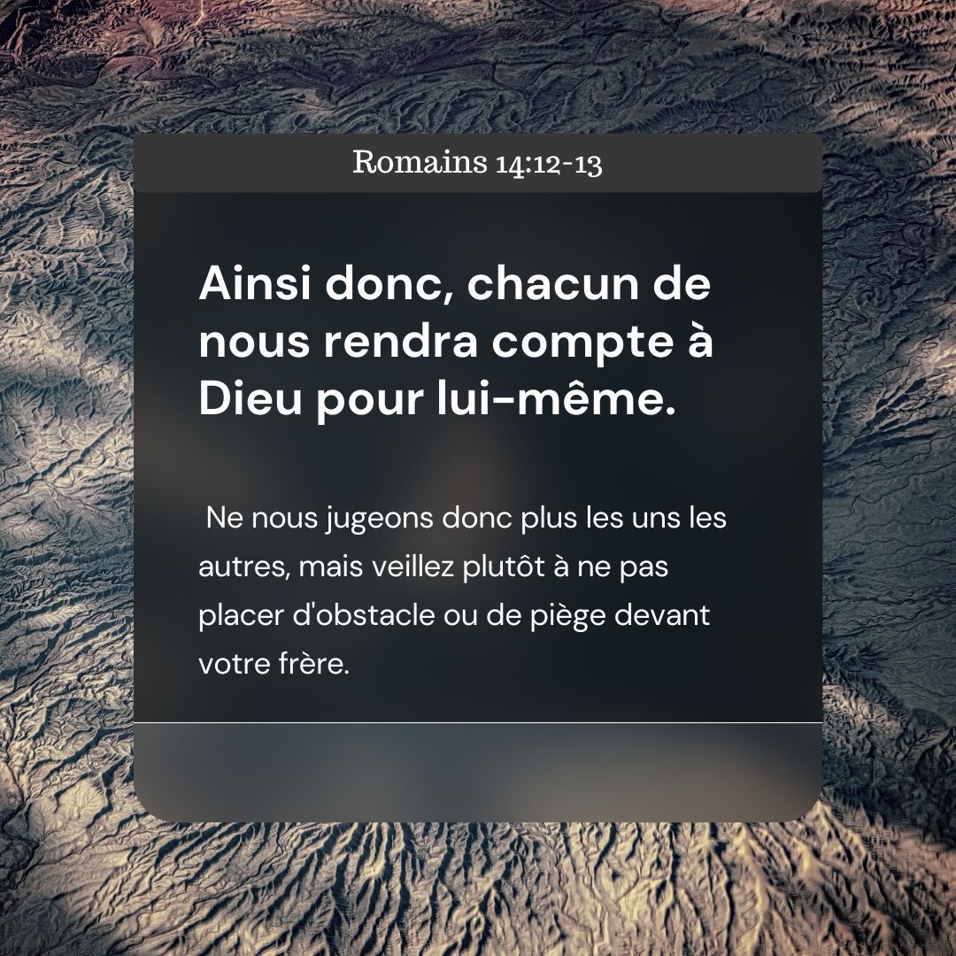 Accepter et accueillir chacun comme il est, c'est mettre du parfum dans la relation, c'est mettre en place les meilleures conditions d'un partage bénéfique pour tous. Gardons nous de juger, ce n'est pas de notre compétence et nous n'avons pas tous les éléments pour le faire. Ne perdons donc pas notre temps... L'apôtre Paul a eu la sagesse de renvoyer chacun à sa responsabilité personnelle dans ses choix.