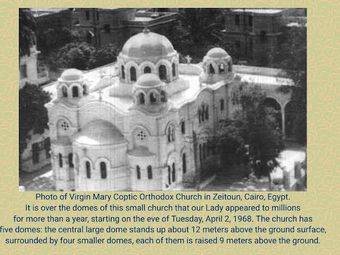 Lieu: quartier de Zeitoun, au Caire, sur une église copte dédiée à la Vierge Marie, construite sur un site où la tradition situe le passage de la Sainte Famille lors de la fuite en Égypte.