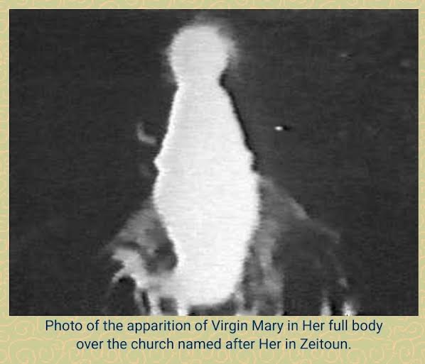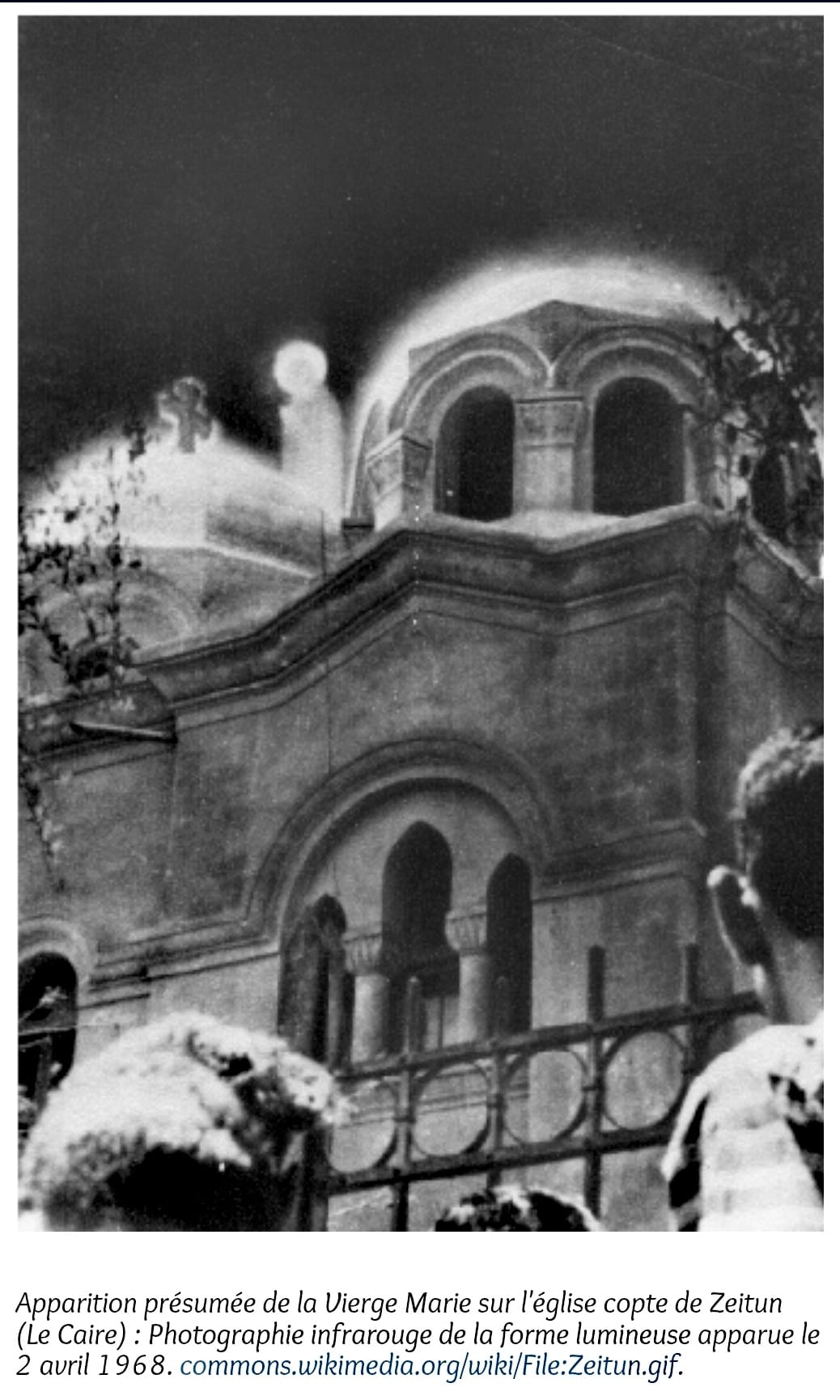 Miracle documenté, vérifié et reconnu par l'église: la figure de la Vierge Marie est apparue au-dessus de l'église copte orthodoxe Sainte-Marie, dans le quartier de Zeitoun au Caire, entre 1968 et 1970. C'est l'un des phénomènes mariaux les plus spectaculaires du XXe siècle, tant par la durée (au moins 2 ans, et encore aujourd'hui) que par le nombre de témoins de toutes confessions religieuses (au moins 250.000, et jusqu'à 1 million selon les estimations les plus hautes).