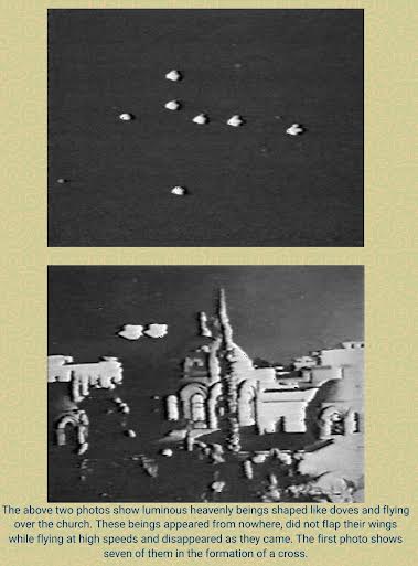 Forme des apparitions: silhouette lumineuse, blanche, de la Vierge se tenant ou se déplaçant au-dessus des dômes de l'église, parfois tenant un rameau d'olivier, entourée de phénomènes lumineux (pluie de «diamants», sortes de colombes de lumière, éclairs silencieux, nuages lumineux).