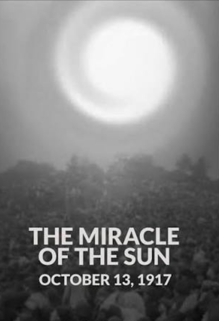 13 octobre 1917 : C'est le jour du grand miracle ! Entre 50.000 à 70.000 croyants, incrédules et représentants des autorités locales, surveillés par des centaines de militaires, accueillent Lúcia dos Santos et ses cousins Francisco et Jacinta Marto, à la Cova da Iria. Dès le début de l'apparition, Marie dévoile son identité et dit être Notre Dame du Rosaire de Fátima. Elle demande très vite que l'on fasse construire une chapelle, sur ce terrain aride et sec, et promet une fin imminente de la guerre en Europe. Une énième fois, elle insiste sur la récitation quotidienne du chapelet, avant de repartir au ciel. À ce moment-là débute le grand miracle du Soleil. Celui-ci donnait l'impression de danser et tournoyer sur lui-même. Presque à heurter la Terre. Sœur Maria Lúcia de Jésus et du Cœur Immaculé écrira, bien des années après : « À côté du Soleil, Saint Joseph avec l'Enfant-Jésus et Notre Dame, vêtue de blanc avec un manteau bleu. Saint Joseph et l'Enfant-Jésus semblaient bénir le monde avec des gestes qu'ils faisaient de la main, en forme de croix. […] J'ai vu Notre Seigneur, et Notre Dame qui me donnait l'impression d'être Notre Dame des Douleurs. […] Cette Apparition disparut et il me sembla voir encore Notre Dame sous l'aspect de Notre Dame du Carmel. ». Ce miracle n'a pour l'heure aucune explication astronomique et scientifique plausible. De nombreux cas de conversions et de guérisons inexpliquées eurent lieu, ce jour-là.