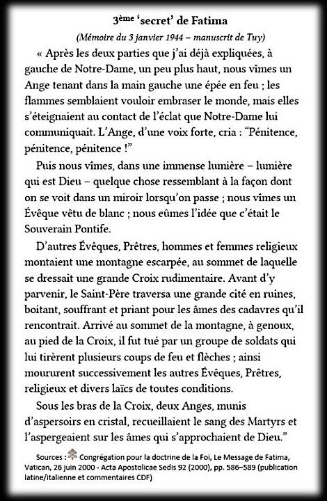 Et nous vîmes dans une lumière immense qui est Dieu: «quelque chose de semblable à l'image que renvoie un miroir quand une personne passe devant»: un Évêque vêtu de Blanc. Nous eûmes le pressentiment que c'était le Saint-Père. Plusieurs autres Évêques, Prêtres, religieux et religieuses gravissaient une montagne escarpée, au sommet de laquelle était une grande Croix de troncs bruts comme si elle était en chêne-liège avec l'écorce ; le Saint-Père, avant d'y arriver, traversa une grande ville à moitié en ruine et, à moitié tremblant, d'un pas vacillant, affligé de douleur et de peine, il priait pour les âmes des cadavres qu'il trouvait sur son chemin.