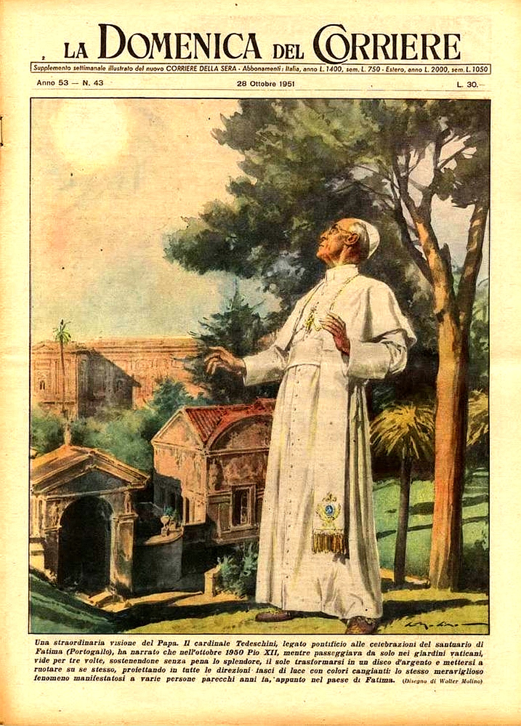 «Pie XII était très persuadé de la réalité du phénomène extraordinaire, auquel il avait assisté bien quatre fois», déclara Soeur Pascalina Lehnert, la religieuse gouvernante de l'appartement papale. Ce qu'on nomme «le miracle du soleil» s'était déjà produit le 13 octobre 1917 à Fatima, au terme des apparitions aux trois bergers.