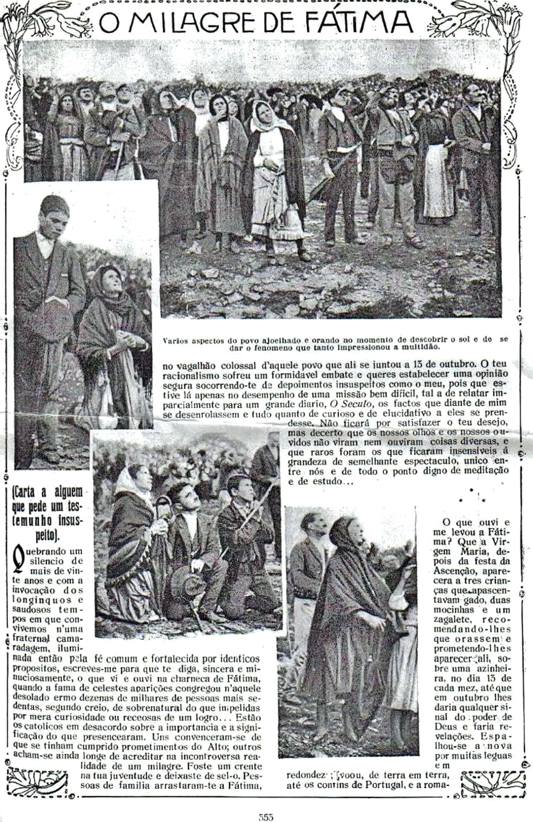 M. Avelino d'Almeida, journaliste laïque et non-croyant, envoyé par le quotidien O Seculo et témoin oculaire le raconte ainsi dans sa chronique : «Et on assiste alors à un spectacle unique, et en même temps incroyable pour qui en n'en a pas été témoin… On voit la foule immense se tourner vers les soleil débarassé de nuages, en plein jour. Le soleil rappelle un disque d'argent décoloré et il est possible de le regarder de face sans subir le moindre malaise. Il ne brûle pas, n'aveugle pas. On dirait une éclipse».