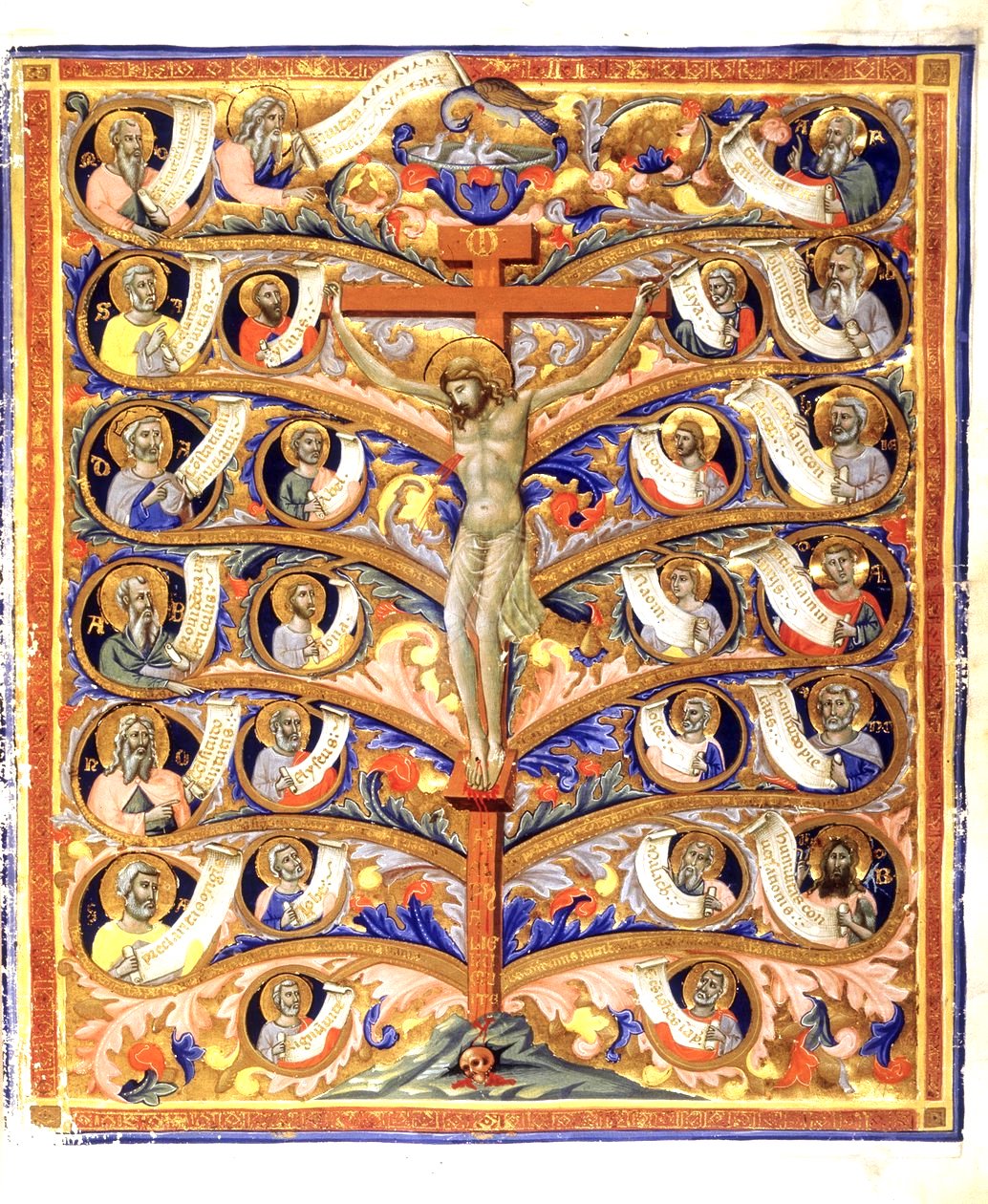 C'est donc l'arbre de la vie éternelle, en la personne même de Jésus-Christ : "Je suis le pain vivant descendu du ciel. Qui mangera de ce pain vivra pour toujours". Manger le pain de vie produit exactement le même effet que manger le fruit de l'arbre de vie: vivre pour toujours. Car le fruit de l'arbre de vie, c'est sur la Croix que nous le cueillons. L'arbre de vie a été cloué à l'arbre de mort et, ainsi fécondé par le sang du Christ, le vieil arbre a refleuri. La mort a rendu la vie.