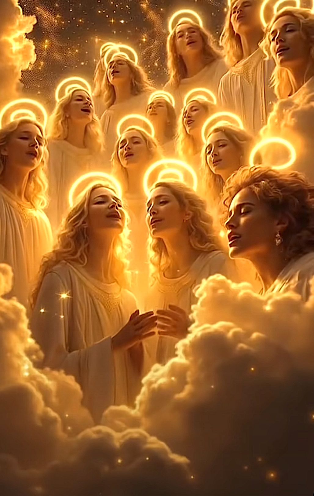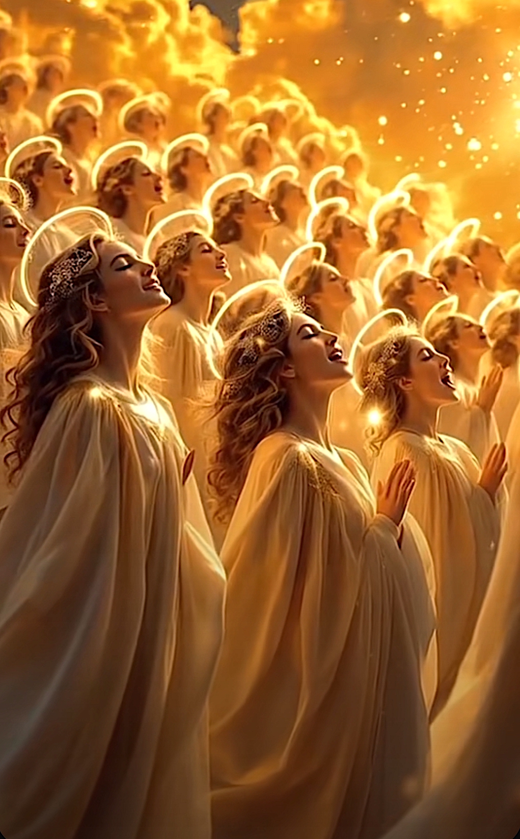Dès le premier instant de la Création, Job montre les anges assistant, émerveillés, à la naissance de l'univers et le faisant retentir de leurs chants d'allégresse: "Qui posa la pierre angulaire, parmi le concert joyeux des astres du matin et les acclamations unanimes des fils de Dieu?" Ces chants n'ont rien à voir évidemment, avec les harmonies terrestres, même les plus sublimes, car ils sont purement spirituels et non matériels; ils ne recourent ni aux instruments de musique, ni à la voix. Se les figurer est impossible à la compréhension humaine. Cependant, la Bible évoque le contenu de ces chants angéliques: "Saint, saint, saint est Yahvé Sabaoth! Sa gloire emplit toute la terre!" (Isaie 6, 3) ; Gloire à Dieu au plus haut des cieux et paix sur la terre aux hommes qui l'aiment!" (Luc 2, 13-14) ; "J'entendis la voix d'une multitude d'anges rassemblés autour du Trône, des Vivants et des Vieillards - ils se comptaient par myriades de myriades et par milliers de milliers! - et criant à pleine voix: "Digne est l'Agneau égorgé de recevoir la puissance, la richesse, la sagesse, la force, l'honneur, la gloire et la louange." (Apocalypse 5, 11-12) etc.