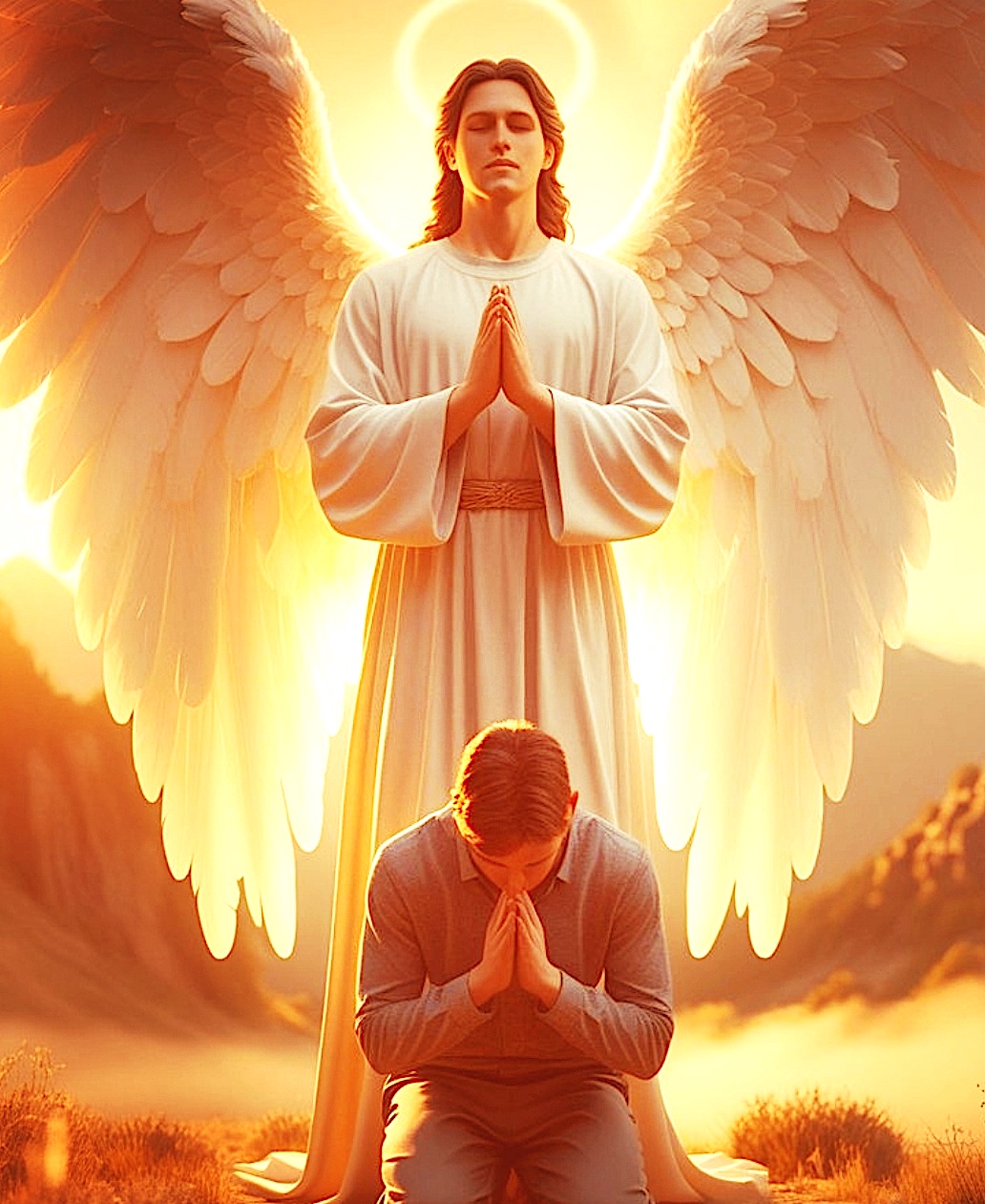 L'ange est par excellence celui qui peut présenter à Dieu les prières des justes en les enrichissant de sa propre sainteté. cette certitude de l'Ancien Testament se retrouve au dernier livre du Nouveau. "Un autre ange vint alors se placer près de l'autel, muni d'une pelle en or. On lui donna beaucoup de parfums pour qu'il les offrit, avec les prières de tous les saints, sur l'autel d'or placé devant le Trône." Clément d'Alexandrie en conclut que l'homme, même s'il prie seul, est mêlé à la prière des choeurs angéliques, et Origène montre les anges se rassemblant autour de ceux qui prient afin d'unir leurs prières à la sienne. "Car s'ils montent au Ciel, c'est pour y porter nos prières; s'ils en descendent, c'est pour nos rapporter les dons de Dieu." ce faisant, ils accomplissent une oeuvre sacerdotale, justifiant la tradition iconographique qui les revêt d'ornements sacrés.