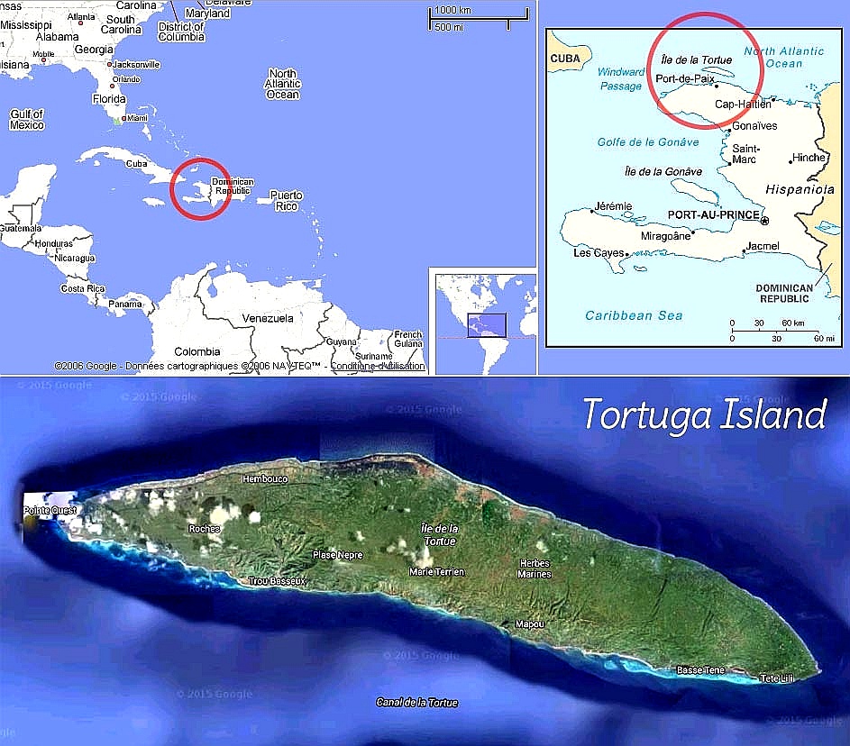 Au VIIe siècle, flibustiers, boucaniers ou parias de tous horizons vont former, sur ce minuscule territoire du bout du monde, une société anarchique et libertaire. Au large de Port-de-Paix, en Haiti, l'île s'allonge en ovale sur 300 km2 parmi les flots mouvants. Pour les yeux du voyageur, elle apparaît comme l'enveloppe d'une gigantesque tortue qui laisserait sa carapace émerger de l'océan. Son nom lui a été donné par Christophe Colomb lui-même.
