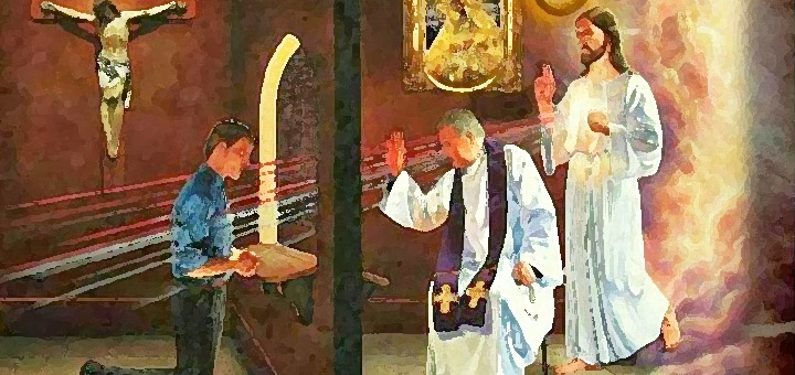 - Mais tu viens te confesser, dit-il. Tu n'as qu'à te mettre à genoux, je vais te donner l'absolution.