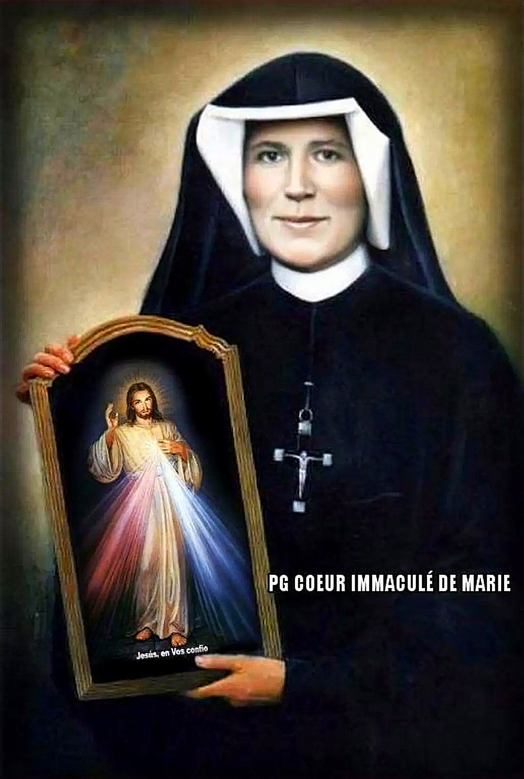 Sœur Faustine relata ainsi cette vision dans son «Petit Journal»: Ce soir, alors que j'étais dans ma cellule, j'ai vu le Seigneur Jésus revêtu d' une tunique blanche. Il avait une main levée pour bénir et de l' autre il écartait son vêtement sur sa poitrine. De sa tunique entrouverte jaillissaient deux grands rayons, l'un rouge et l'autre translucide (…) Au bout d' un instant, Jésus m' a dit: «Peins un tableau selon le modèle que tu vois, avec l'inscription: Jésus, j'ai confiance en toi. Je désire que l'on vénère ce tableau d'abord dans votre chapelle, puis dans le monde entier (P. J. 47).