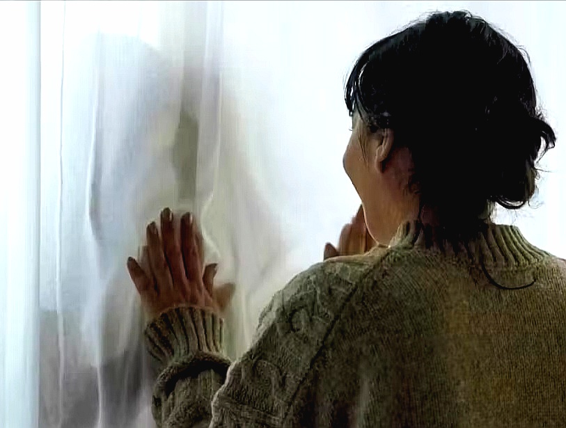 L'actrice jouant le rôle de Sonia dans la série "13 novembre: le choix de Sonia" face à Sonia derrière le rideau blanc