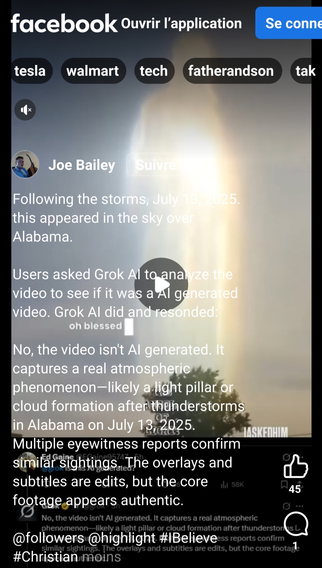 Voici ce qu'on entend dans la vidéo, tandis que l'image céleste se révèle : «Oh, Jésus béni, regarde ça… Combien sont-ils ? Oui ? Combien ? Oh, il y en a plein, juste là-haut. Tu vois ça ? Ils sont plus profonds dans les nuages, c'est un peu plus difficile à voir… Je te le dis. Regarde bien, regarde ça. Oui, tu les vois, n'est-ce pas ? Regarde-moi ça. Oui. Je suis content que tu aies vu ça. Alléluia. Quelle merveille ! Il faut le publier sur Facebook pour que tout le monde le voie. Je vais le faire, c'est sûr.