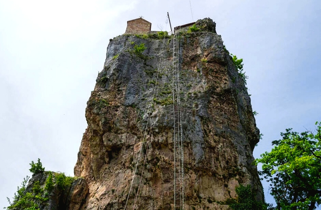 L'église qui domine la région d'Imereti, à 200km à l'ouest de Tbilissi, la capitale géorgienne, est nimbée de mystère. Seuls quelques moines veillent jalousement sur ses secrets, autorisés à gravir une échelle haute de quarante mètres qui les emmène, chaque jour, au sommet du piton rocheux où le monument est édifié. Cette ascension leur prend une vingtaine de minutes. Il y a fort à parier que nombre de curieux seraient prêts à un tel effort si cela leur était permis… Mais l'église est un sanctuaire bien gardé, autant qu'une attraction touristique désormais inviolée. Selon le média américain CNN journal, qui lui a consacré un long article en 2019, ce piton rocheux - et l'église qui le surmonte - est l'un des lieux les plus sacrés au monde. Les femmes - même celles qui appartiennent à un ordre religieux - n'ont pas l'autorisation de s'y aventurer.